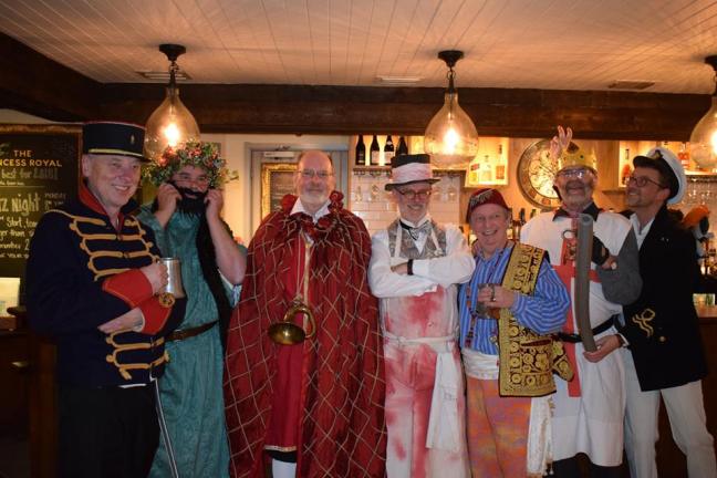 We didn’t have a narrator, so as if designed to confuse, a character dressed as a mediaeval crusader burst into each pub, only to be revealed later by Father Christmas (dressed in green to add to the audience’s perplexity, resplendent in new illuminated headdress) as the nasty, wicked King George. Boo, hiss!
