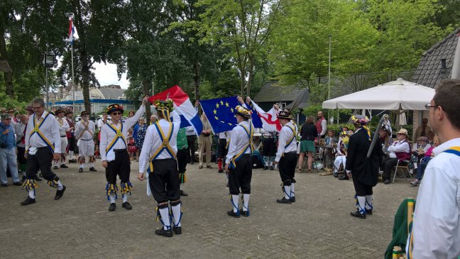 A bit of a lie in for everyone, our hosts kindly providing tea/coffee on a trolley for the desperate. Brilliant breakfast again with a vast range of eggs, hams, cheeses and breads. Vast activity as we broke camp and loaded cars. Our finale was at the campsite and was well attended by locals eager to watch the morris. We performed ‘Maid of the Mill’, Ilmington with Graham using flags – one English, one Dutch and one EU which caused a stir. The dance was very well received amidst the usual carnage of flying flowers and bouncing hats.