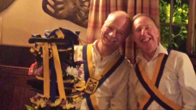 After a while we left Basingclog and Fleet to continue to entertain whist we headed down the road to one of our season favourites – The Plough. Again the front of the pub was cordoned off with beer barrels in readiness. Lovely beers on offer including Otter Amber – yum yum! And this was a rather special occasion tonight with both Baz and Phil finally retiring (Yeah!) and as the great chaps they are they bought all the beers! Thanks lads! Loads more 8 man dances kept Dennis busy including the Cheesy Grin dance (aka Jenny Lind) which went down well with the audience who voted Baz to have the cheesiest grin of all. As a prize Baz bought himself a beer! Two little kiddies in the audience really enjoyed the show and happily joined in Glorishers to round off a good set of dances.