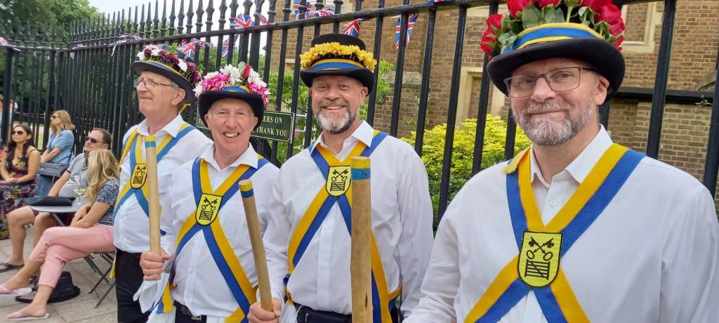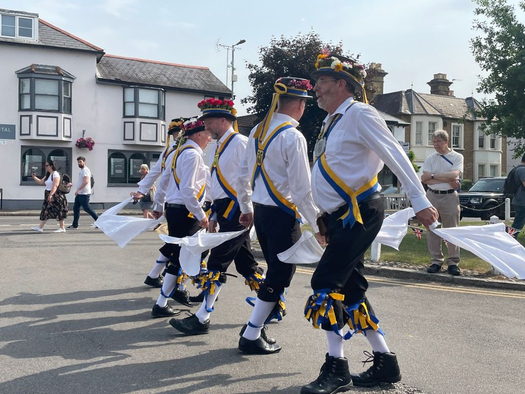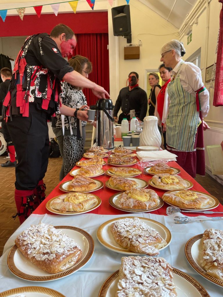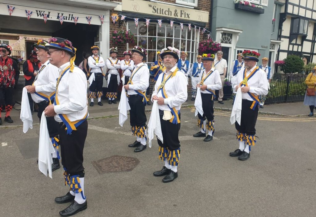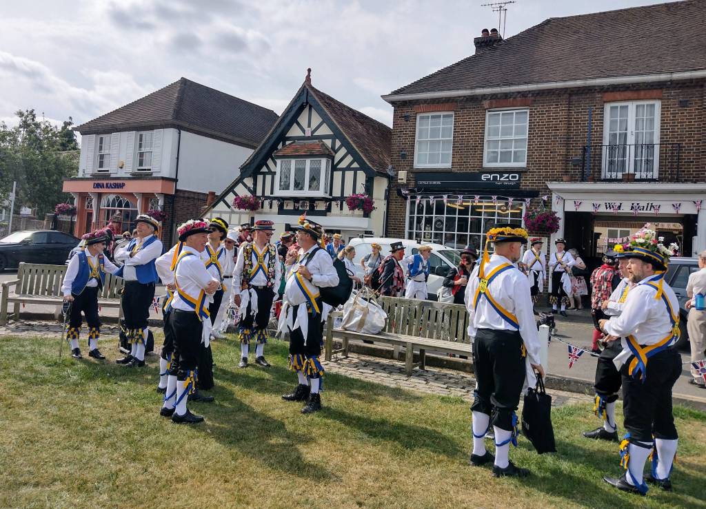 An early start as Chris F toured North Hampshire and bits of Surrey to collect Chris C, Paul, Ian Y, and then Rod, before heading to Datchet (pronounced Dashay by the cognoscenti). With three dancers and two music, we thought we could do a few three man jigs to warm up, but no need as the Datchet side were there in force at the WI hall, providing tea, coffee squash and immense, excellent pastries, all freshly baked locally. Fuelled and ready, we all moved outside to dance on the green. Jackstraws, Hurst, Thames Valley and Taeppas Tump were led by Datchet. ( Taeppas was a celebrated warrior and the oldest known resident of Maidenhead.)
