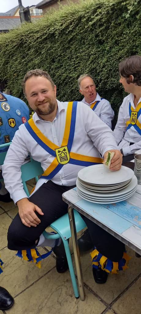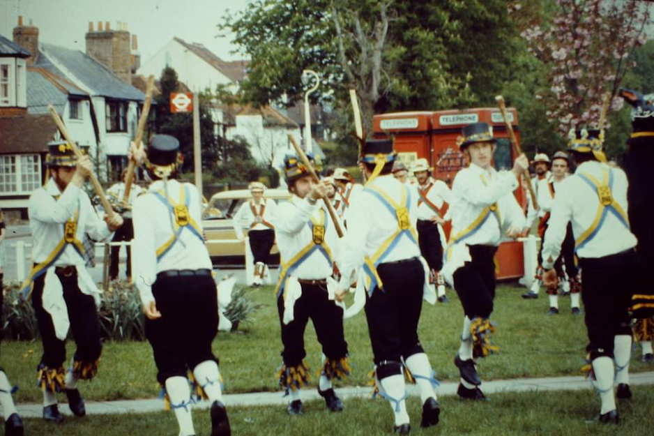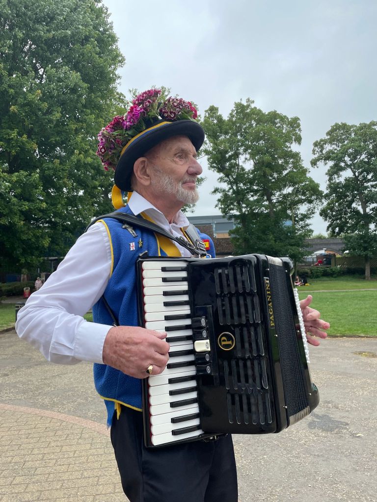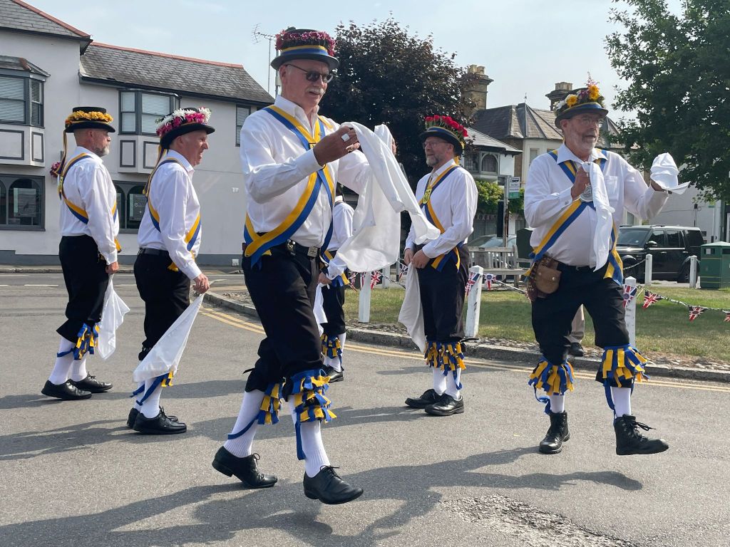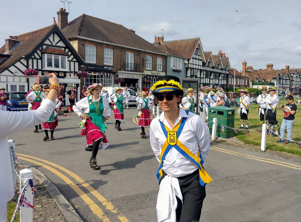 An early start as Chris F toured North Hampshire and bits of Surrey to collect Chris C, Paul, Ian Y, and then Rod, before heading to Datchet (pronounced Dashay by the cognoscenti). With three dancers and two music, we thought we could do a few three man jigs to warm up, but no need as the Datchet side were there in force at the WI hall, providing tea, coffee squash and immense, excellent pastries, all freshly baked locally. Fuelled and ready, we all moved outside to dance on the green. Jackstraws, Hurst, Thames Valley and Taeppas Tump were led by Datchet. ( Taeppas was a celebrated warrior and the oldest known resident of Maidenhead.)