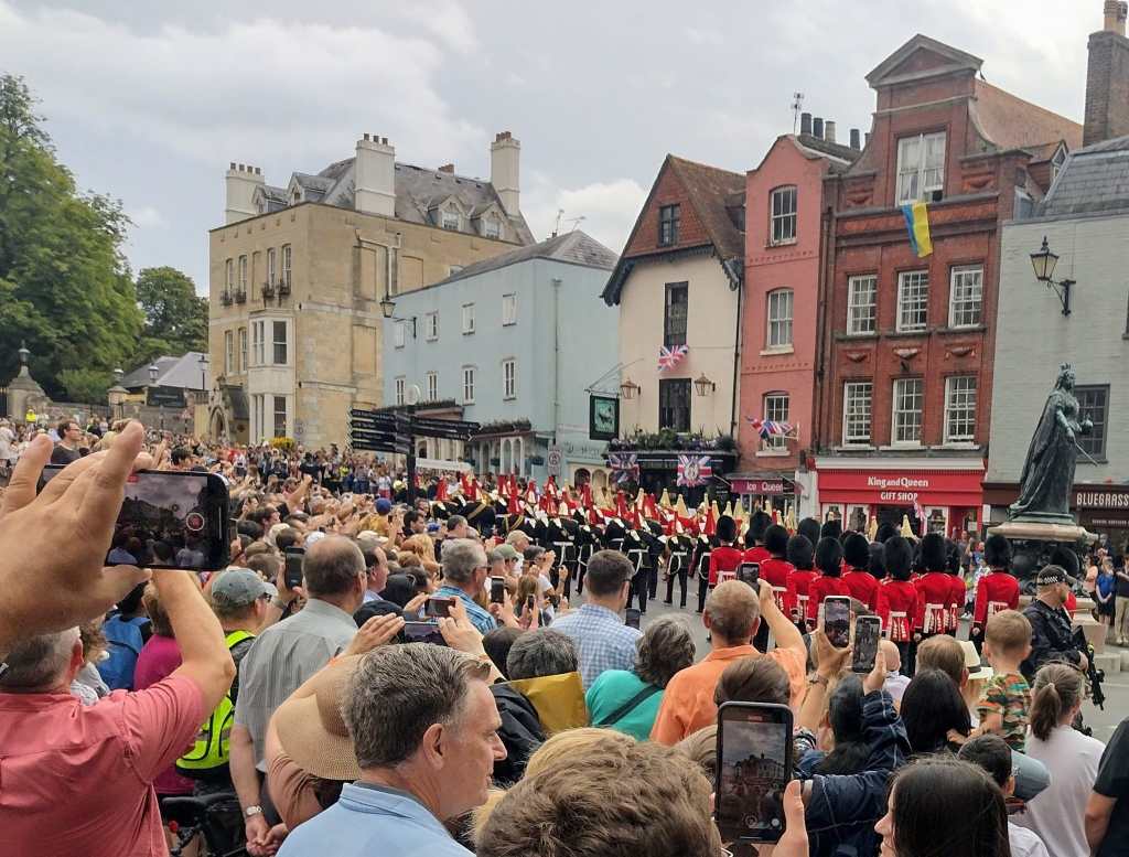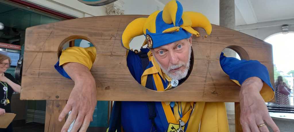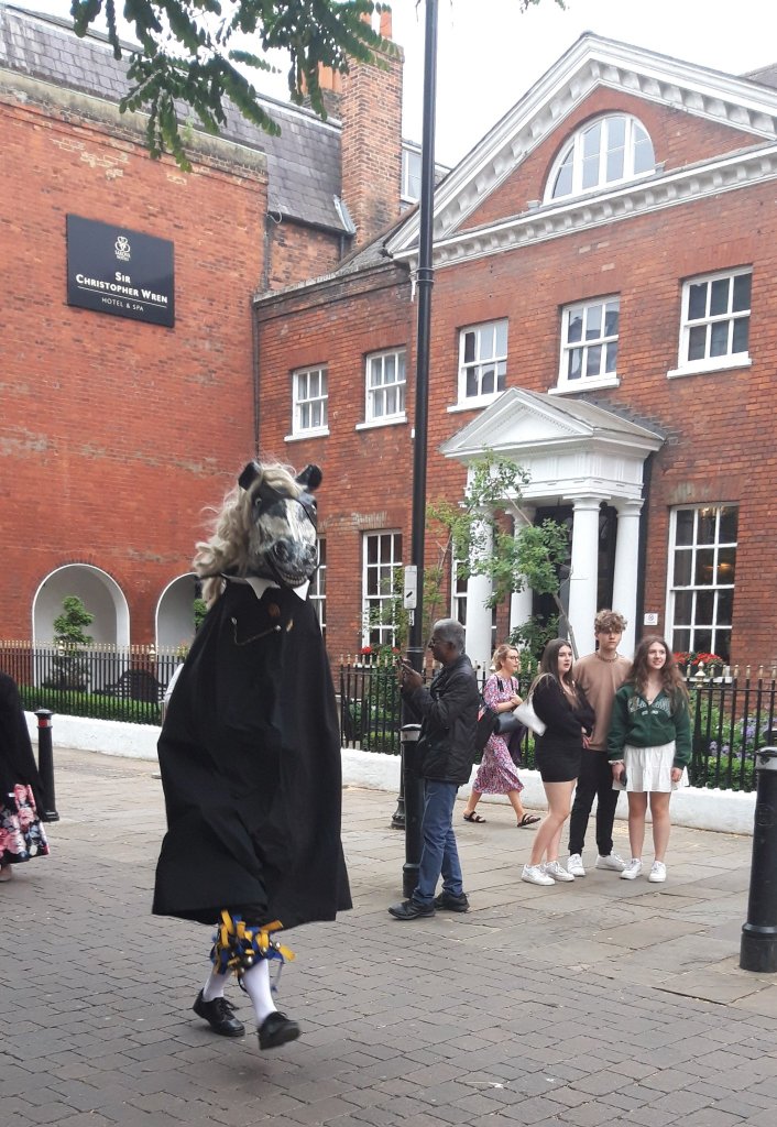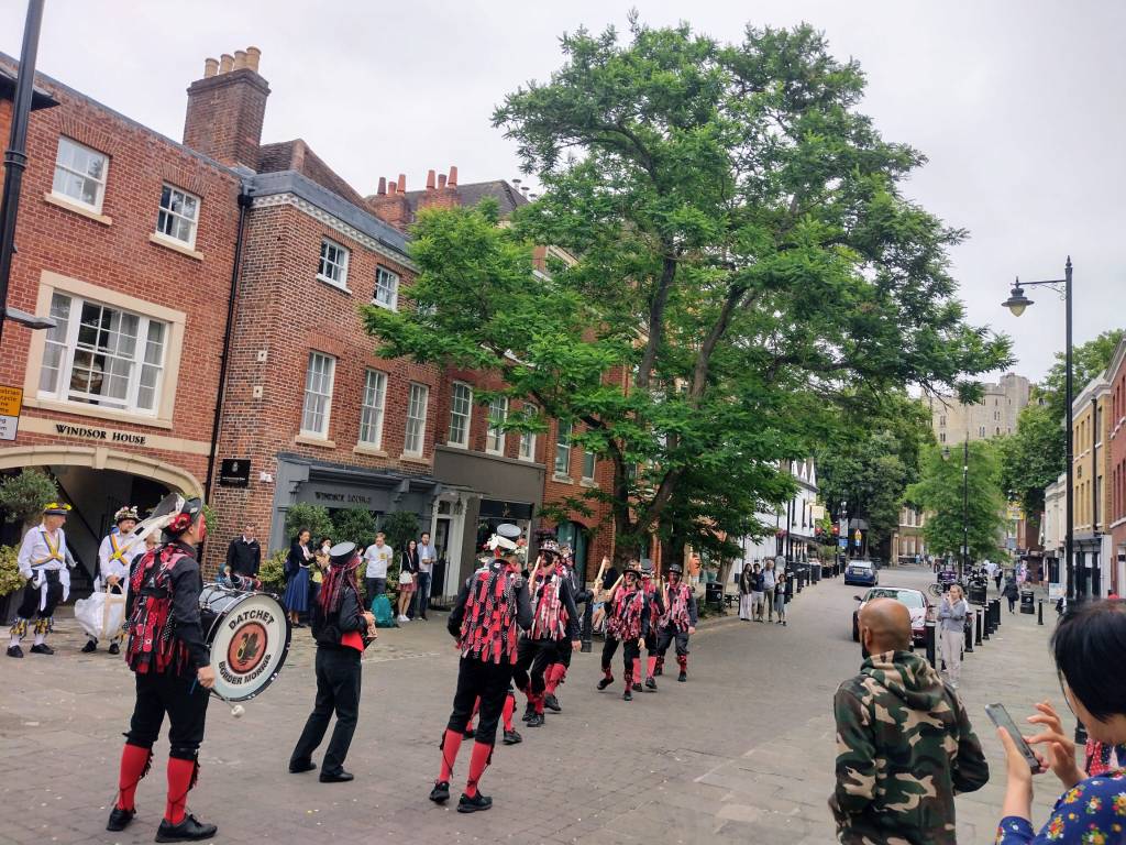 A walk up to the Castle entrance so those not watching the Household Cavalry as they changed the guard, could see us and then down to the post office for a few dances before it tried to rain. We sheltered in The Piper for a much appreciated libation then off to the Two Brewers by the park, where there was much evidence of horses fertilising the road, signs telling us not to drink here, or take drinks there, and please be quiet and respect the residents. Fortunately one side had a percussion section ! There were far fewer visitors and tourists than previous years, particularly obvious was the lack of those watching us and wanting to be photographed with us.