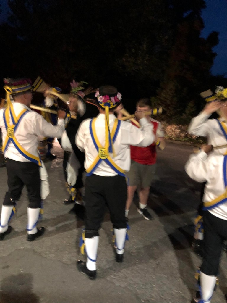 Off to Plough, Little London a real Hampshire hidden gem. Still warm as dusk fell with dancers getting sweatier by the dance. Really nice to welcome YOB Ed Rennie, Annie and Jacob … and Myrtle all the way from Cornwall, hope to see you all again soon. We did get into gear here, entertaining a noisy crowd with great gusto and regular bellowing. The Brute was more of a hit here, with one one request to ‘decorate the Horse for Christmas’ – hmmm, no paint, glitter or permanent attachments.. Jacob Rennie dances with Tinners Morris (great lads who we bantered with at Chippenham FF a few years ago) and joined us in the Upton Stick dance – did really well.