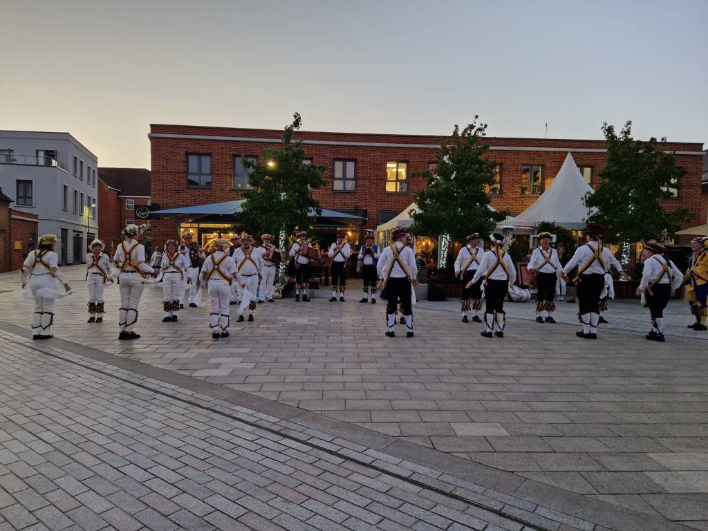 After a few dances from each side we headed off bound for the programmed Ship Inn. Andy P had the bright idea of dancing in the new square just beyond Waitrose and towards Rose street. This impromptu session brought out many of the locals who were eating or drinking on the peripheral establishments. A massed dance of Shepherds Hey, Bampton was performed, whilst Yateley used hands and Ellington used hankies, wedemonstrated how the same dance could be performed in different ways. The onlookers clamoured for more but we we shortly due at the Ship circa 21.00.
