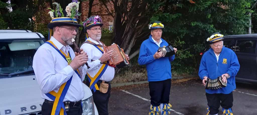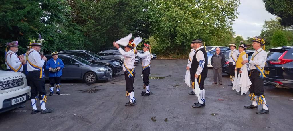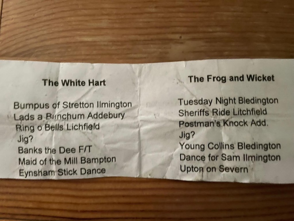 A good set was danced with plenty of banter. Magnificent lines and sticking captured in a photo. David played ‘Bold Nelson’s Praise’ (Ilmington) for Baz, Paul and Ross. The Brute declined to come out, apparently too damp for his delicate hooves…..
