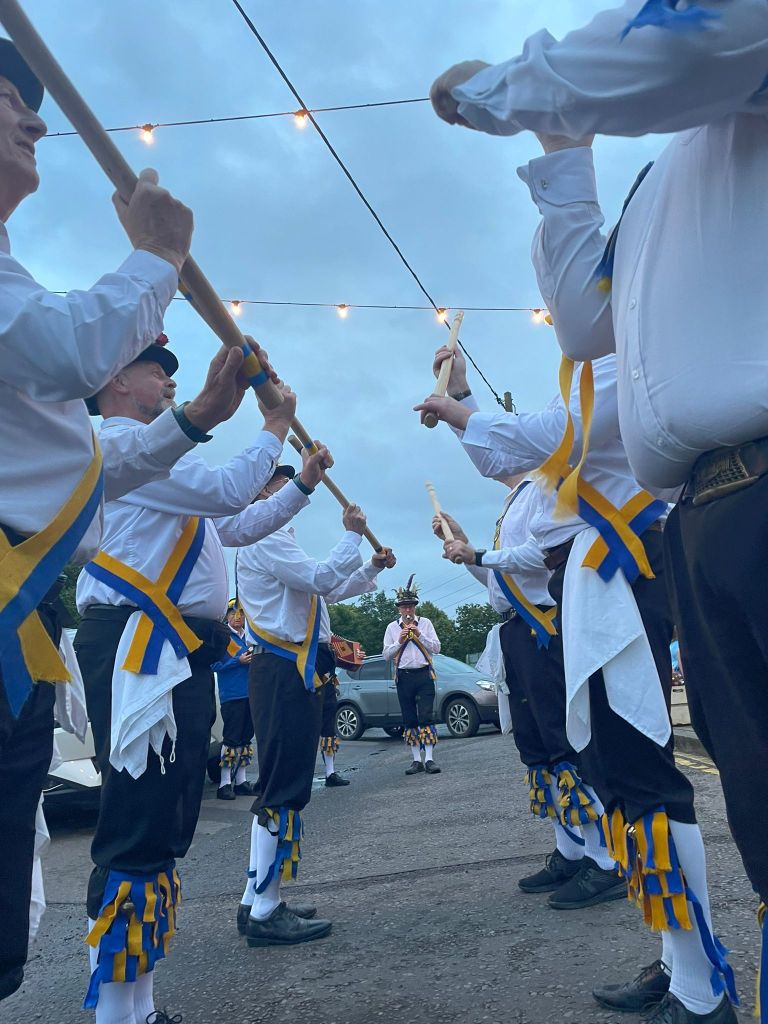 White Hart is a gorgeous pub, with options for dancing – garden, front or car park. Car park it was. Some rusty old dancing to start with (Fool shouting: ‘they all need a couple of pints of WD40 down the back of their trousers’. Apologies to one very nice lady who came out to watch…who had never seen morris dancing.