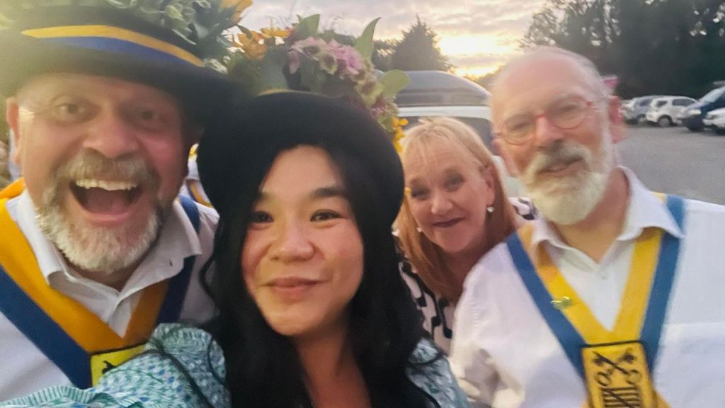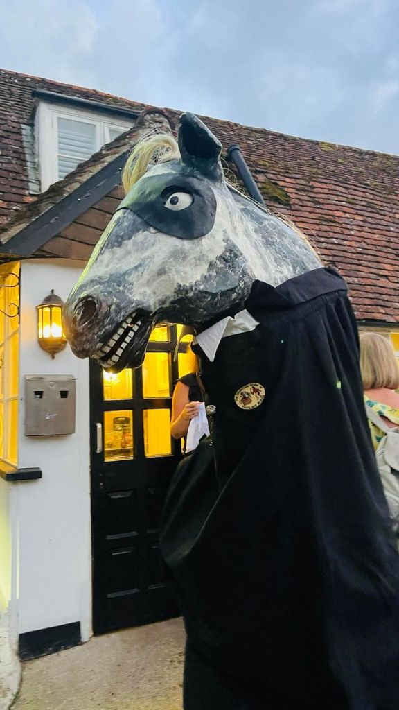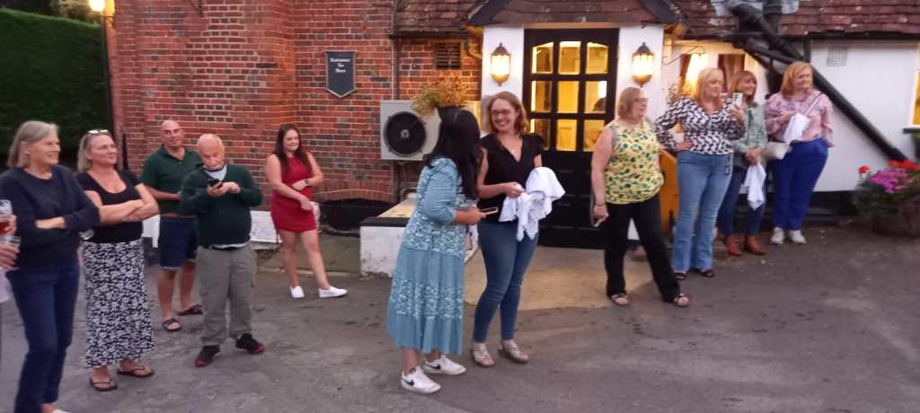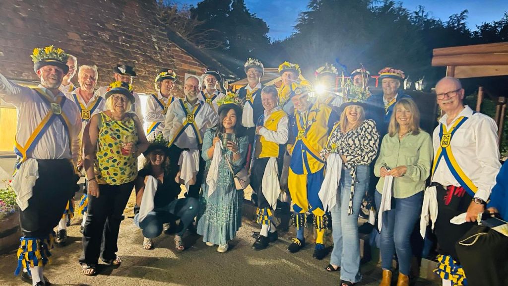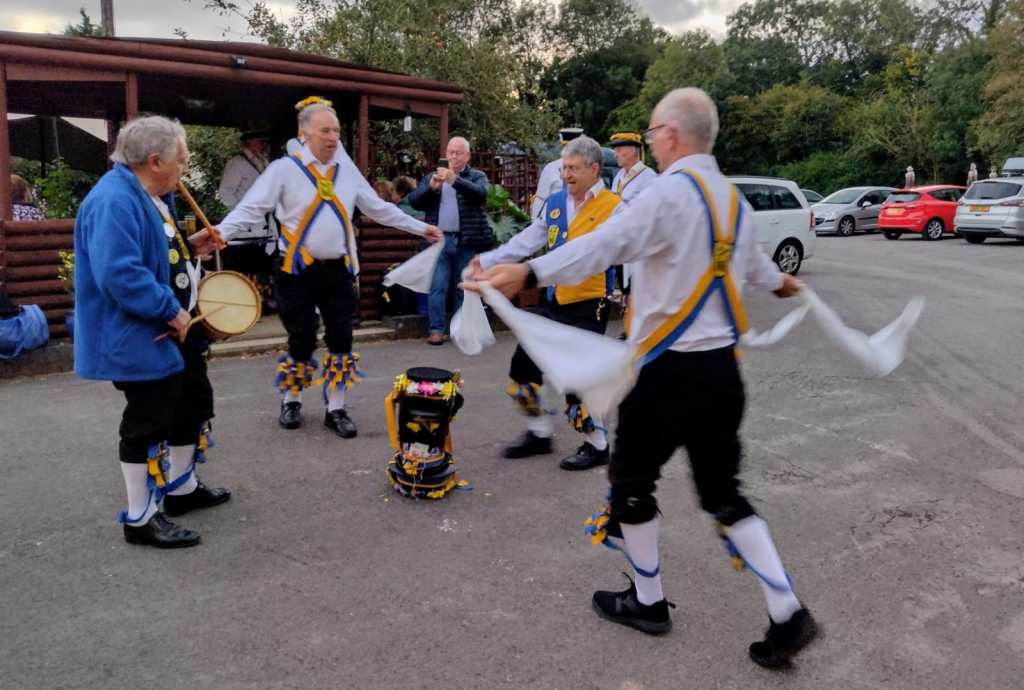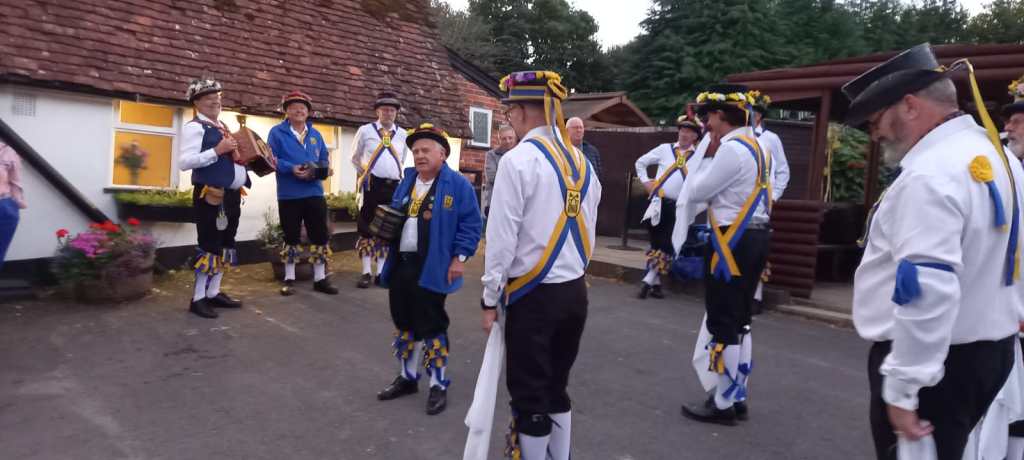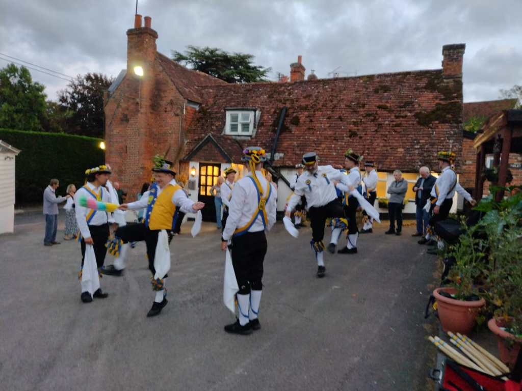 Always an atmospheric night, dancing in daylight, through the dusk and into a dark, balmy autumn evening – white shirts shining and brass bells twinkling. Well supported by our lovely families and friends – including a large contingent who had enjoyed our performance in Fleet so much they had booked up for a meal at the F&G. A lovely touch, they had made personalised handkerchieves with tiny bells a the corners o they they could join – which they did!