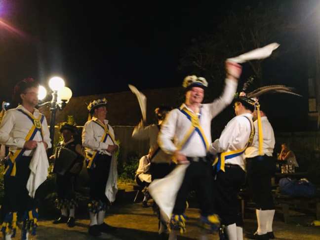 We piled into the historic pub, very thirsty now and promptly overwhelmed the solitary but obliging barmaid. Much better beer – Landlord and Proper Job in good nick. Straggled into the garden to surprised looks from the locals. We had plenty of time to chat before getting underway in the sultry, sweaty darkness. Nice to meet up with Nigel Sparkes as well. Really good, rambunctious couple of sets followed, perhaps not technically perfect but delivered with great joie de vie. The Fool did not like the call ‘all in and beat the Fool to bits’ but responded vigorously with his wobbly stick. Muzza arrived as well! The cautious crowd became captivated and stayed all the way through and most joined in an unlikely Shepherd’s Hey ‘joiny inny’ joyously spilling out into the road. A spontaneous singing session lad by David and Muzza finished off a really fun, relaxed yet energetic evening. Thanks Baggas!
