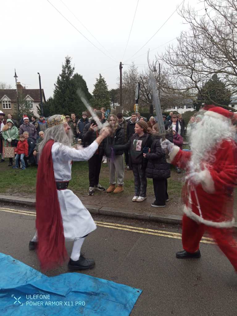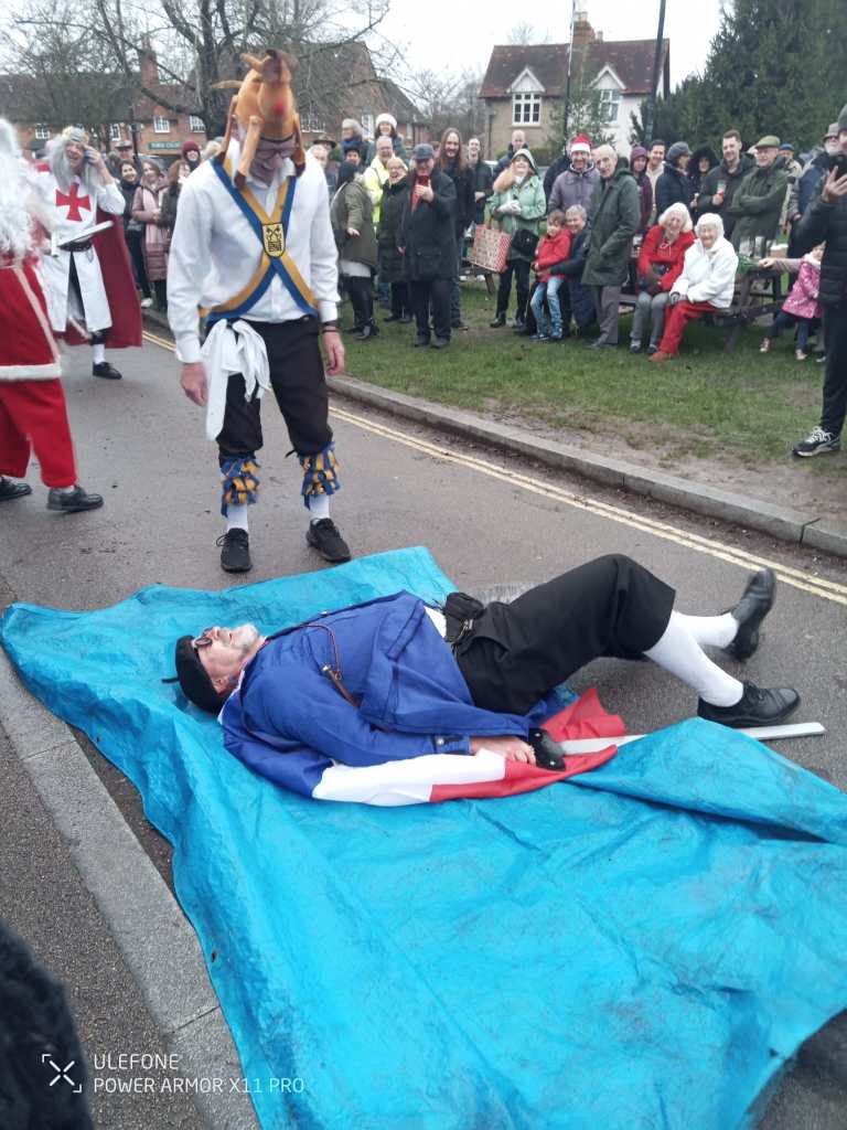 A swift journey to Yateley, another big crowd with many friends patiently waiting for us. To our delight there were many ‘Yateley Old Boys’ (or YOBS, as we affectionately refer to them) and families – Roger, Dave, Julian, Gareth, Dan, Hugh, Tom (and probably others what we have embarrassingly forgotten). Brill. Great to see them, never enough time to talk and really catchup. XXX. On with the dancing, another good display, and mumming – much roaring. Our audience were right behind us and seemed to enjoy our performances. Our final dance was a joinny inny ‘Bonny Green’ and lots of cheerfully bemused folk eagerly took up an invitation to ‘have a go’. Just Lovely.