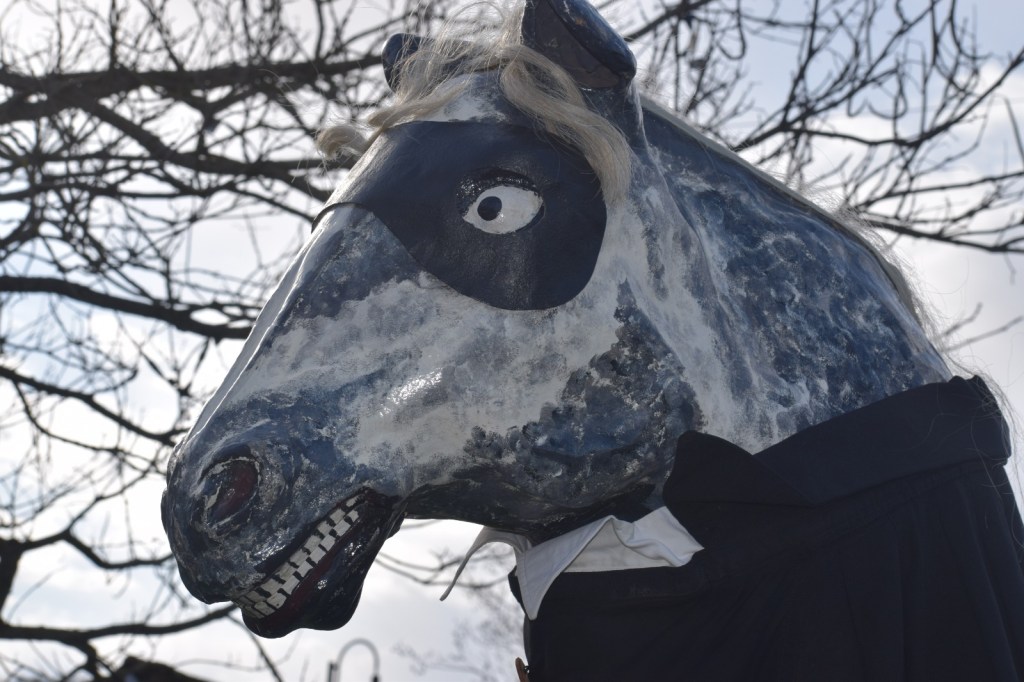 Our Horse often works together with the ‘Fool’ of the side. Their objective is to entertain the audience between dances so that the dancers can regroup and get their breath back. He even has his own Facebook page, where his hooves tap out stories and he is often rude about the Morris Men or ‘Erberts as he calls them…or whifflers….or fluffers… He is not at all vain.